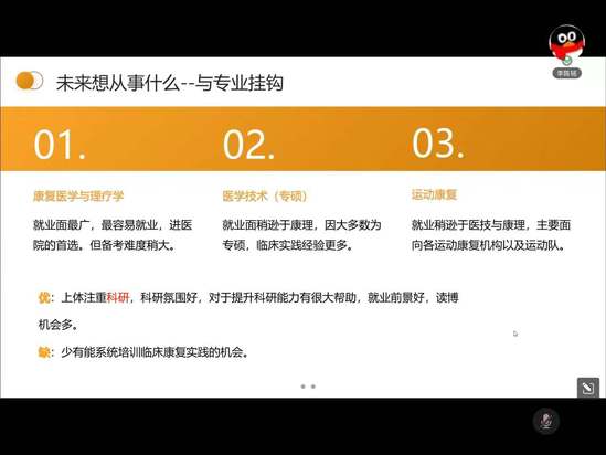 为积极落实学校2025年“就业指导服务月”“学风建设月”专项行动,助力学生明晰职业发展方向、提升就业与考研竞争力,学院于近日组织召开了面向护理学(老年护理)与康复学(老年康复)专业的线上考研与就业经验分享会,并联合医学院开展面向临床医学(老年医学)专业的考研经验专场交流。会议邀请了2025届在升学和就业方面表现优异的优秀学生代表,围绕考研备战、求职准备与职业发展等关键议题,与在校同学进行了深入交流与分享。