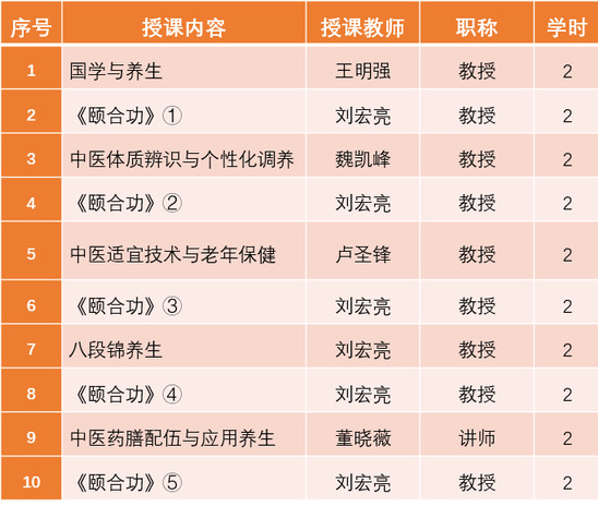 本课程共20学时,内容由浅入深、动静结合,既传递专业中医养生知识,又提供可落地的健康养护方案,让银龄学员在轻松学习中收获身心健康。课表如下: