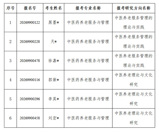 根据《南京中医药大学2026年全日制博士研究生招生章程》和《养老服务与管理学院2026年博士研究生招生考核实施方案》的要求,经过导师和专家组复审,现将入围我院综合考核的博士研究生申请者名单公布如下(按报考研究方向及报名号排序):