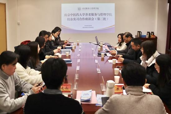 2026年1月22日下午,我院在丰盛楼101会议室召开第二批校企实习合作座谈会。学院党总支书记孙新新、执行院长王明强、党总支副书记兼副院长苏文娟、副院长陈娜,以及来自省内外7家养老机构的11位代表共同出席会议。会议由陈娜主持。