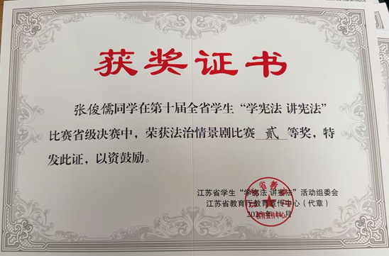 近日,由江苏省教育厅主办的第十届全省学生 “学宪法 讲宪法” 法治情景剧比赛顺利落下帷幕。我院学子原创作品《老江求职记》紧扣法治核心主题精心打磨剧本,凭借精湛的舞台演绎能力与细腻传神的角色刻画,在全省众多参赛队伍中崭露头角,成功斩获省级比赛二等奖。