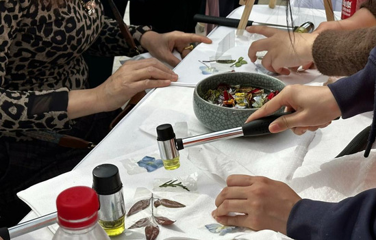 在植物书签制作区,志愿者们引导现场嘉宾和游客将精心挑选的中草药植物叶片、花瓣巧妙组合,封存在透明书签材料中。一片薄荷叶搭配一小朵菊花,不仅有着清新的外形,还寓意着清肝明目。