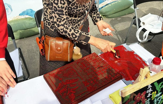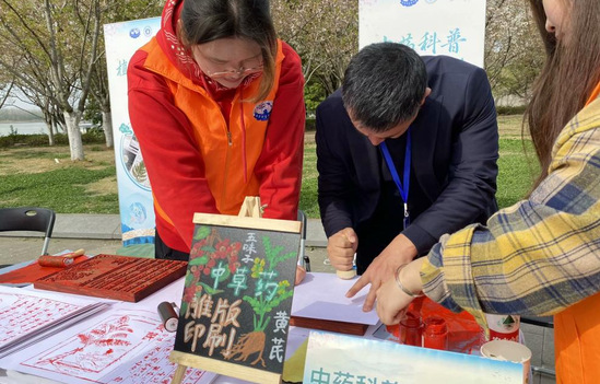 在中草药雕版印刷环节,志愿者聚焦“以药入艺”创意,打造刻有黄芪、五味子的雕版。参与者用天然染料拓印,制作出兼具美学与科普功能的药典卡片。雕版纹路清晰细腻,药香与墨香交相辉映,激发现场游客参与热情。