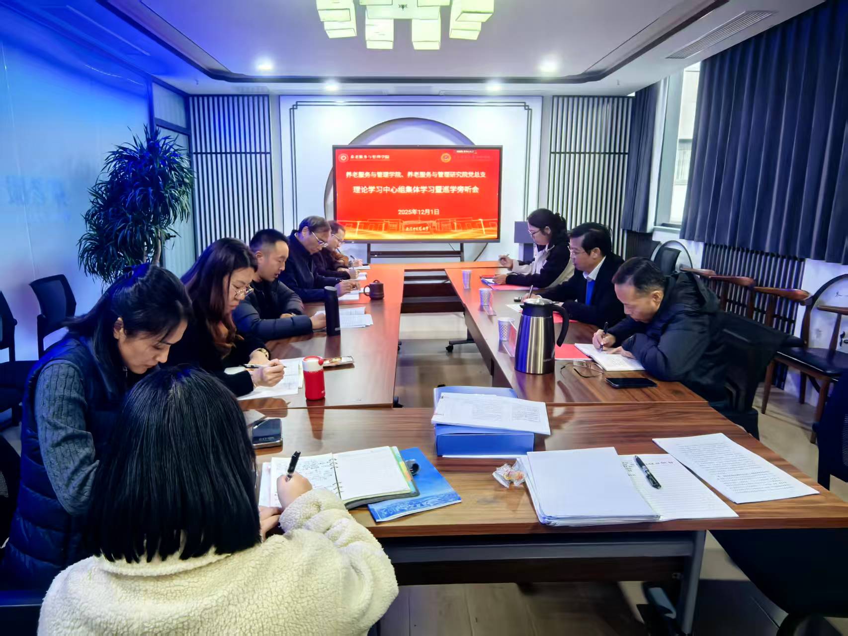 2025年12月1日下午,养老服务与管理学院、养老服务与管理研究院党总支理论学习中心组召开专题学习会,本次学习的主题是:深学笃行二十届四中全会精神 擘画“十五五”规划目标 赋能养老事业高质量发展。校巡学旁听第五工作组组长、副校长胡孔法,财务处处长吴青杨,联络员崇庆华参加会议。会议由学院、研究院党总支书记孙新新主持。