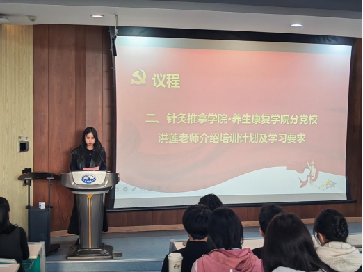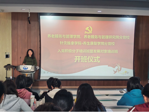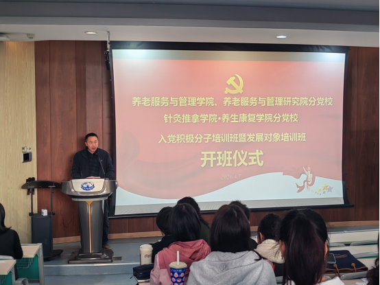为深入学习贯彻习近平新时代中国特色社会主义思想和党的二十大及二十届历次全会精神,切实加强入党积极分子和发展对象的教育培养,提升新发展党员质量,4月7日下午,养老服务与管理学院、养老服务与管理研究院分党校与针灸推拿学院·养生康复学院分党校在B7102教室联合举办2026年上半年入党积极分子、发展对象培训班开班仪式。养老服务与管理学院、养老服务与管理研究院党总支书记孙新新,针灸推拿学院·养生康复学院副书记、副院长刘明,两院分党校班主任洪莲老师、杨菁老师和全体参训学员出席典礼,开班仪式由刘明主持。